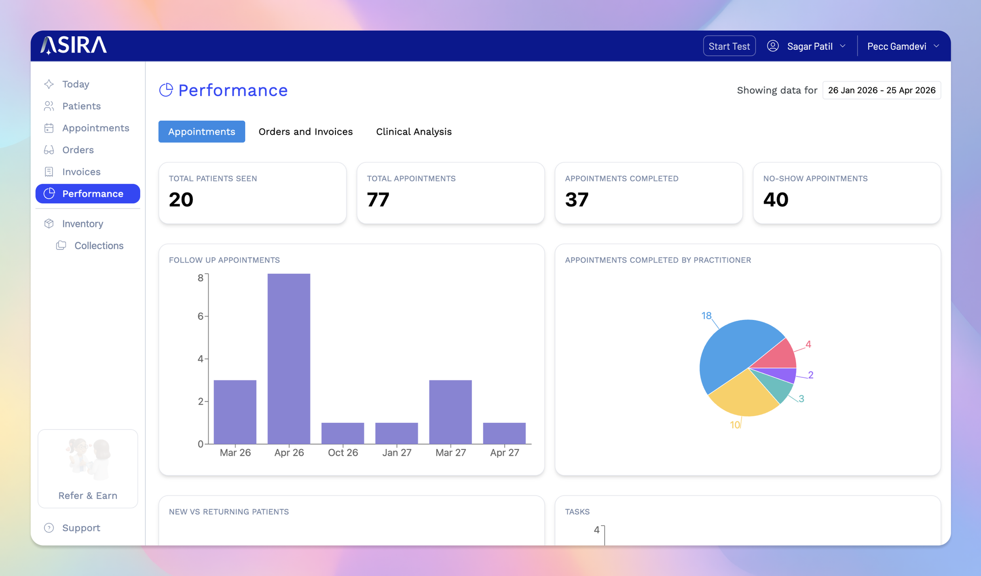 ASIRA’s new Performance section is designed to address exactly these gaps. Instead of making practices sift through endless reports or raw data, the Performance section provides a clean, structured summary of key indicators. It transforms day-to-day clinical and administrative activity into actionable insights.